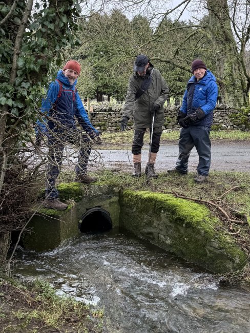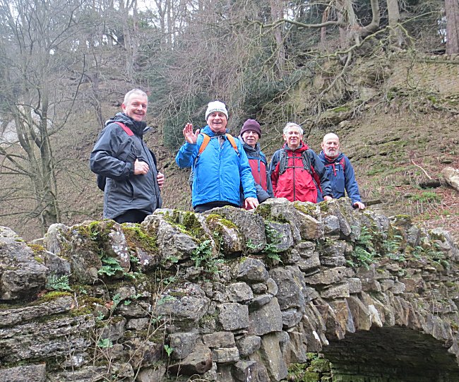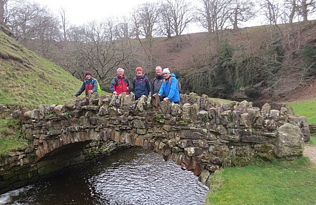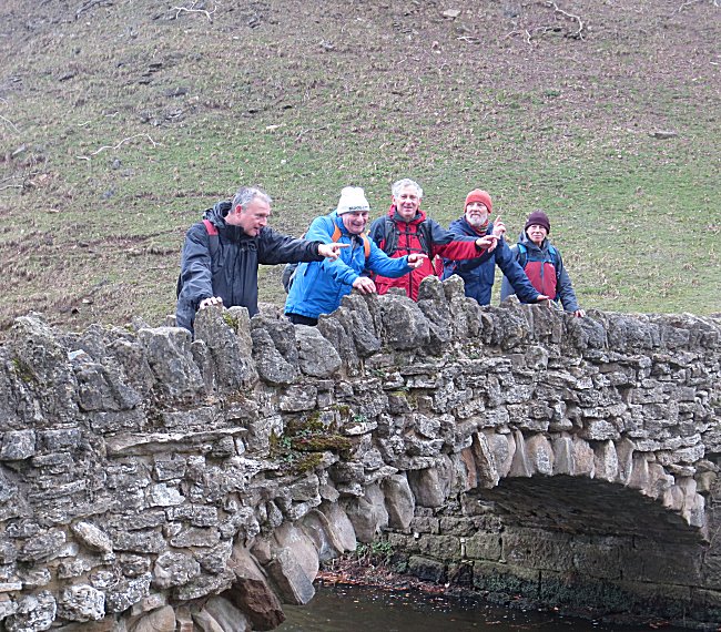 They eagerly set off from the lay-by just outside West Witton searching for bridges that they knew were very scarce on their route. Celebrating their first triumph the walkers gathered for the customary photo |