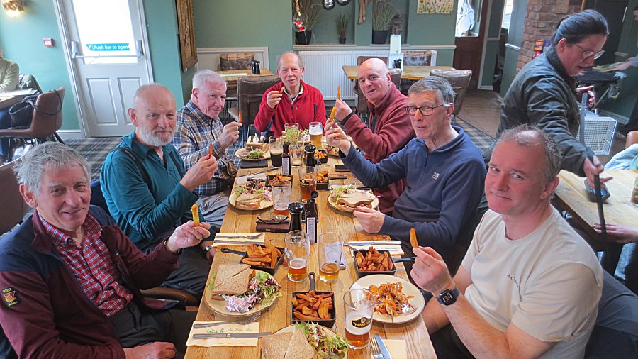 Immediately the walkers hurried to the 'Square & Compass' in the nearby village of North Rigton, where they celebrated their successes with ale, steak sandwiches and chips (except Tom). |