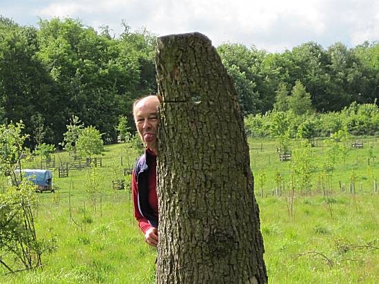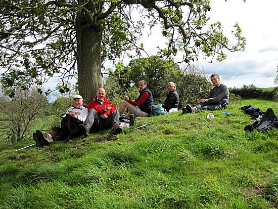 The walkers rested by a gate, before stopping for their 11 o-clock break, where they shared half Sean's excellent pork pie and Alan's mars bar crispies, still wondering whether they would find any daffodils. |